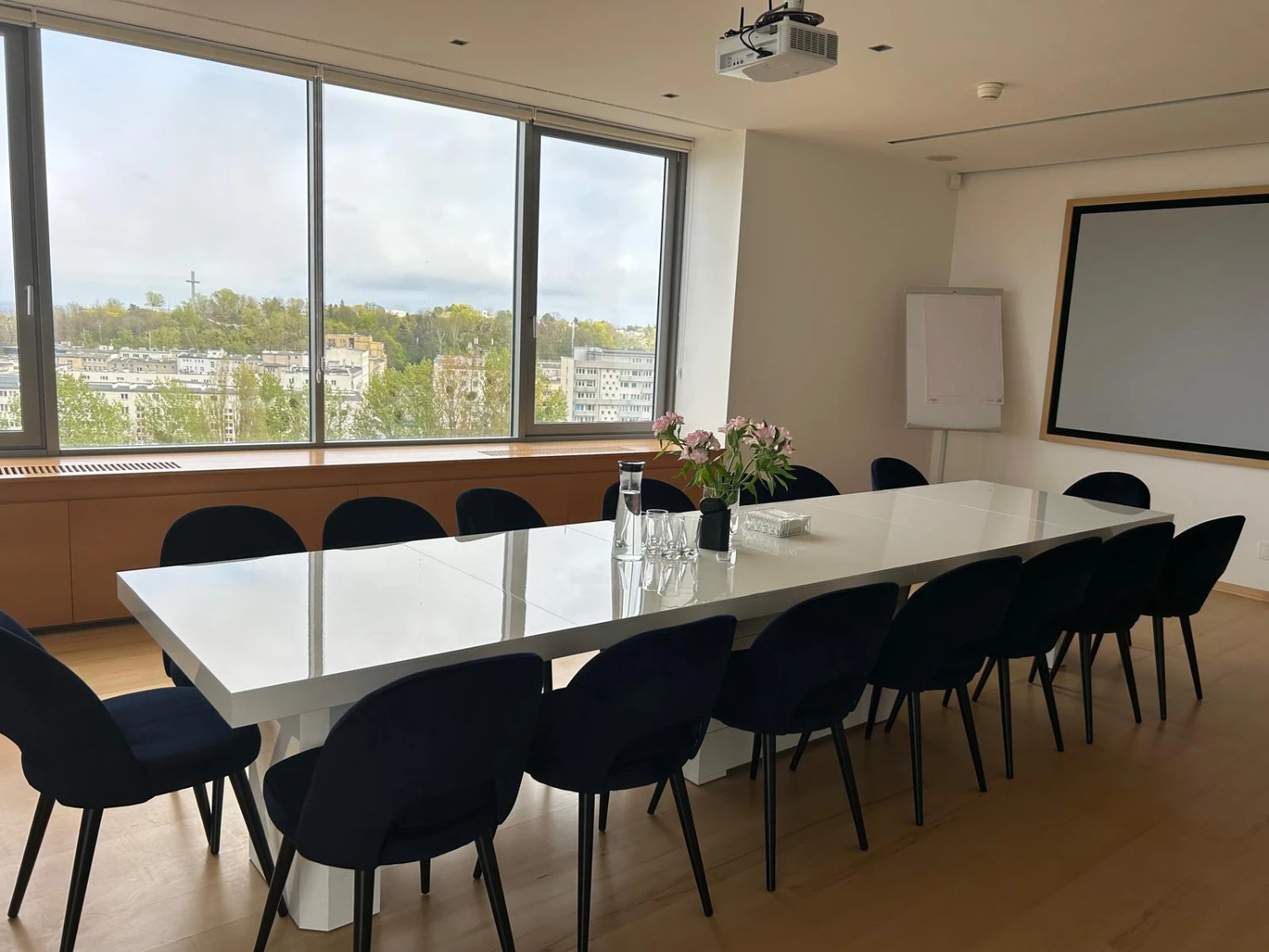 W budynku znajduje się sala konferencyjna dla dwunastu osób, dostępna wyłącznie dla najemców. Można z niej skorzystać elastycznie – nawet na godzinę – co pozwala dopasować przestrzeń do potrzeb spotkań, prezentacji lub rozmów biznesowych.