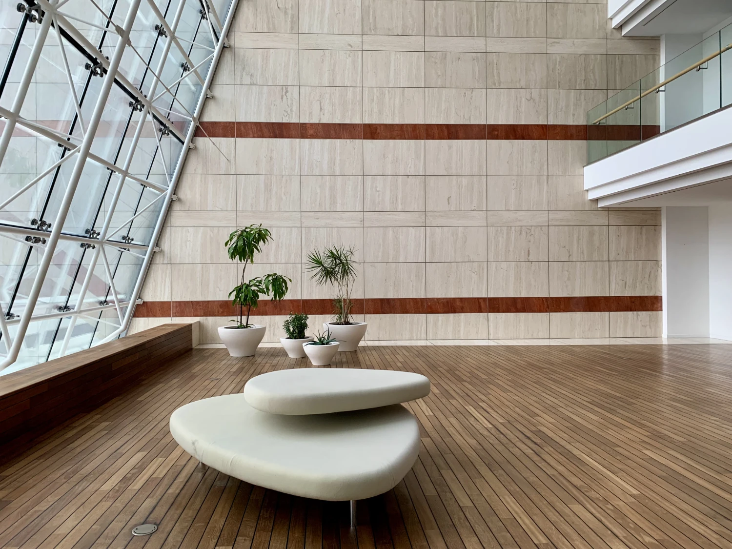 Do wykończenia budynku zastosowano surowce z naturalnego kamienia, trawertynu oraz granitu.